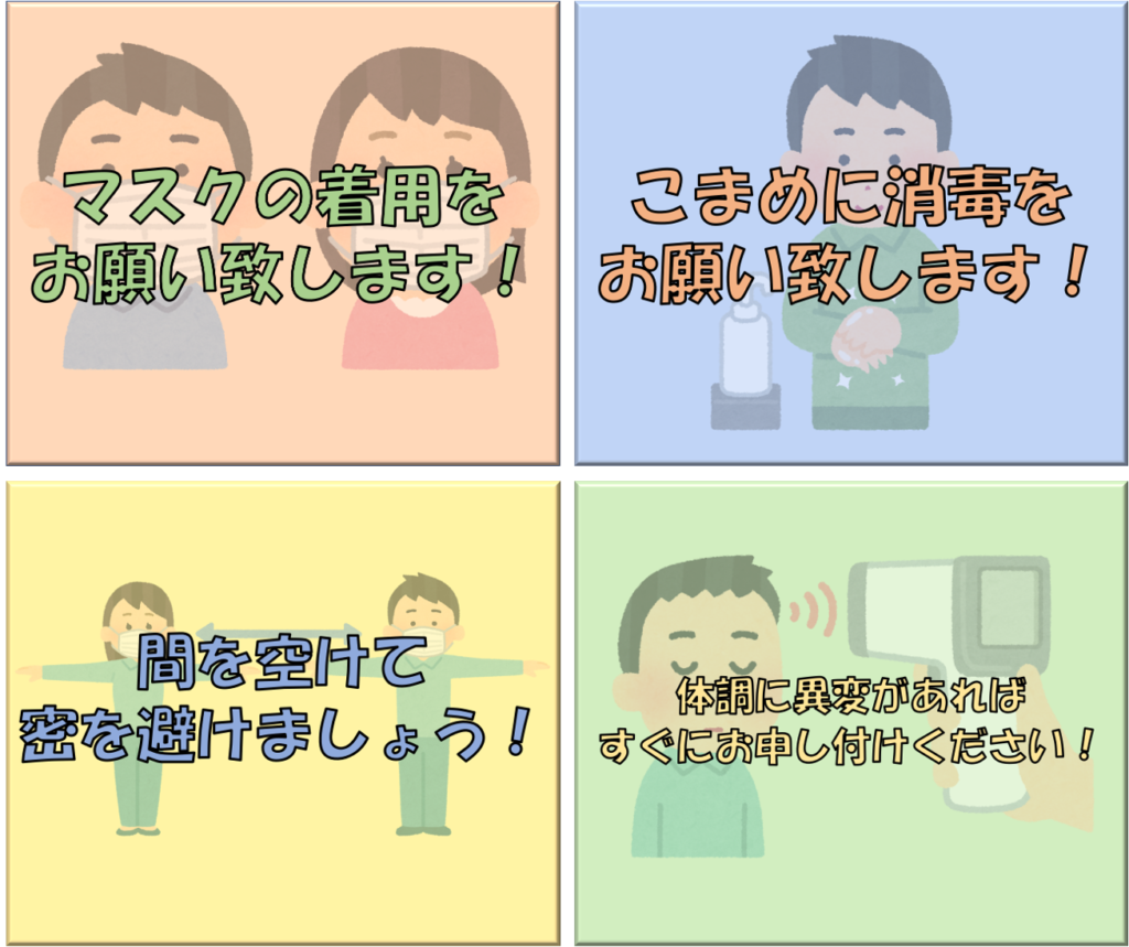 ・開催2週間前よりイベント終了日まで朝の検温と体調チェックを行い、感染の疑いがある場合は参加を見合わせます。